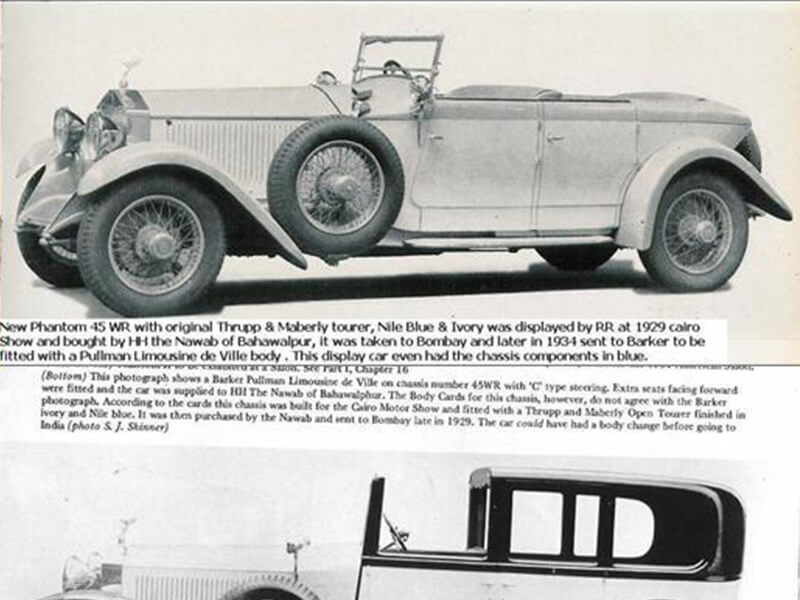 In 1934 the c-in-c of the British army in India and lord Linlithgow, viceroy were to visit Bahawalpur and many Bahawalpur cars including 45wr were sent to UK, to barker & co for fitting with a Pullman limousine de Ville body in beige and black with maroon interior. The car cost the 25-year-old his highness nawab Sadiq Muhammad Abbasi v, ruler of Bahawalpur a princely sum of £2150 plus another £ 900 for the new body.