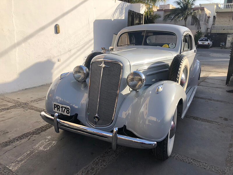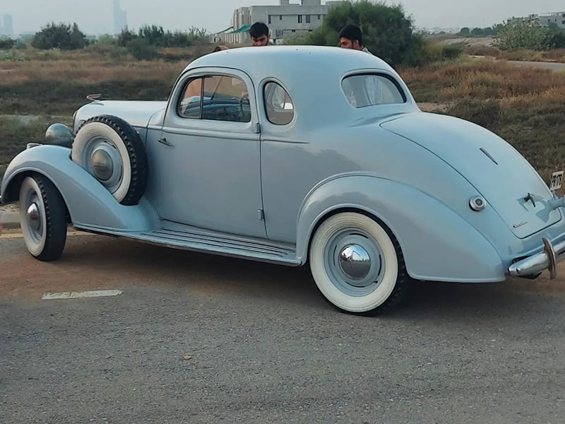 This is a 1935 Chevrolet Master Deluxe. This has two spare tires which the cars for the subcontinent were equipped with. It has a 3 speed gearbox and has suicide doors.